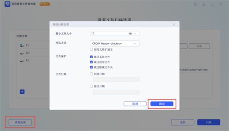 1)在弹出的页面中,可以先点击左下角「高级选项」进行「高级扫描选项」设置并「确定」,方便更快速精准找出自己想找的重复文件。