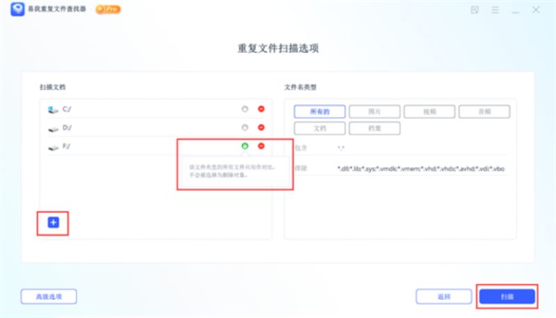 2)在重复文件扫描选项页面中,点击「+」按钮可以选择要扫描的文件夹或磁盘,点击扫描文档列表中右侧「“锁”」图标,则表示该磁盘文件只做对比而不会被选作删除对象,如果不想对扫描列表中某个磁盘或文件夹进行扫描,点击「Θ」按钮去掉即可,在「文件名类型」中也可以根据自己的需求进行选择,完成后点击「扫描」。