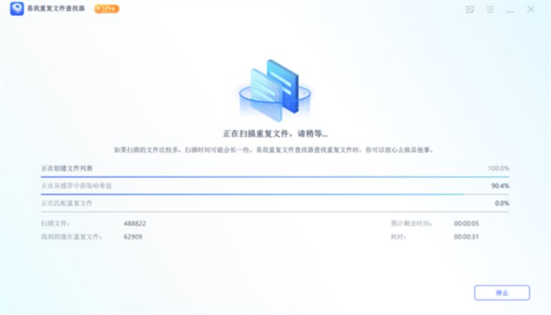 开始进行重复文件扫描,可以在扫描完成前进行「停止」操作。