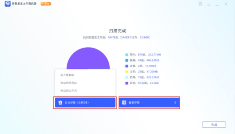 扫描完成后,会出现扫描完成界面,可直接点击「自动移除」,会出现永久性删除、移动到回收站、移动到文件夹三个选项,请根据自己的需求选择;也可点击「查看详情」进入「重复文件报告」页面。