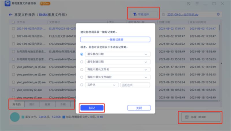 在「重复文件报告」页面中,会显示出所有重复文件,可根据文件类型更准确选择自己要删除的文件,同时也能在「智能选择」中使用「一键标记策略」和「手动标记策略」来确定删除的文件,标记后点击右下角「移除」并选择对应选项。